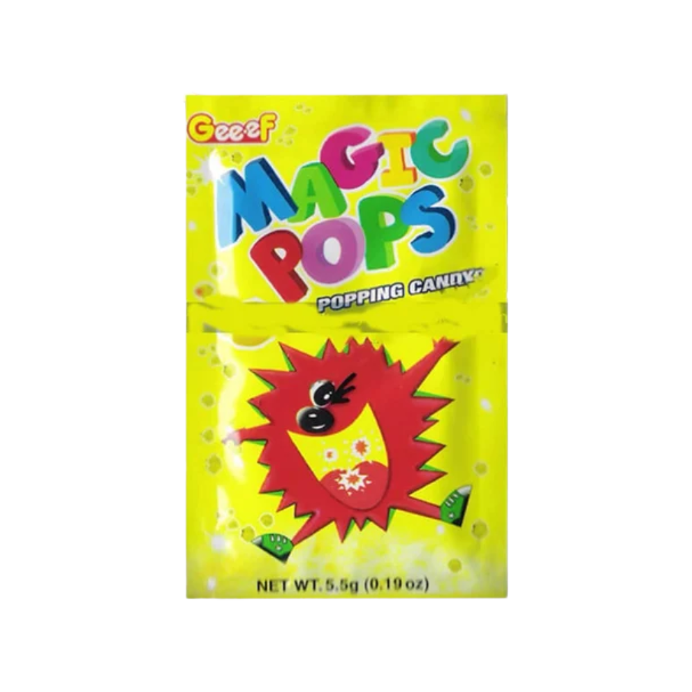 xperience a fun explosion of flavour with Gee.ef Magic Pops Popping Candy – Lemon Flavor! Each pouch is packed with tiny crystals that pop, crackle, and fizz the moment they hit your tongue, giving you a playful and refreshing snacking experience. The bold lemon tang adds a delicious citrus twist, making every packet a vibrant burst of sweet and sour excitement.